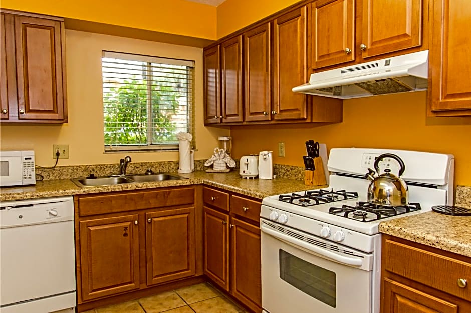 This villa features a fully equipped kitchen and a living area with a large double-sized sofa bed.